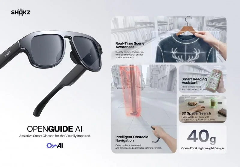 韶音AI眼镜双亮相,以开放式智能深化场景融合 作为韶音可穿戴生态的关键延伸,OpenGuide AI与OpenVision分别聚焦于视觉辅助与运动体验两大场景,诠释了韶音“开放式智能”的产品理念。 OpenGuide AI专为视觉辅助场景设计, 注重环境感知与语音交互。产品具备实时语义映射能力,可识别物体、颜色及熟悉面孔,并通过语音以辅助空间感知。其智能导航功能可识别楼梯、车辆等障碍物,提供距离与方向提示;该产品也可作为阅读助手朗读文本,支持即时翻译与内容总结。此外,通过3D空间搜索功能,OpenGuide AI可分析用户周围环境,结合位置与距离信息协助物品定位,旨在提升日常出行的便利性与安全性。