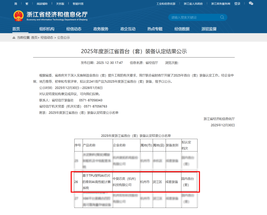 近日,浙江省经济和信息化厅正式发布2025年度浙江省首台(套)装备认定结果,中昊芯英(杭州)科技有限公司(以下简称“中昊芯英”)自主研发的、搭载自研TPUAI专用算力芯片的“泰则AI高性能计算系统”,凭借领先的技术创新与行业应用价值,成功入选“国内首台(套)装备”名单,标志着公司在AI算力核心装备领域的研发实力与技术突破获得权威认可。