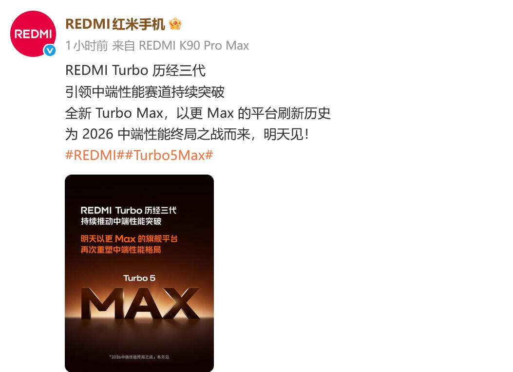 【科技快报网讯】REDMI 红米手机官宣REDMI Turbo明日发布,将“以更 Max 的旗舰平台,再次重塑中端性能格局。”小米创办人,董事长兼CEO雷军也发文为REDMI Turbo预热。