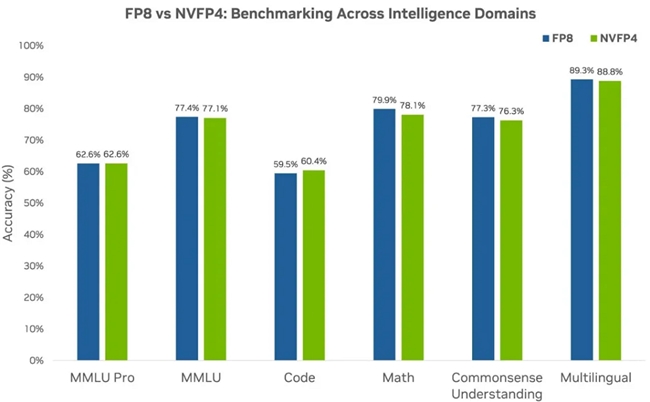 PGX的Blackwell GPU支持NVIDIA专为推理优化的NVFP4(4-bit浮点)格式,结合FP4量化技术,能够实现接近FP8的精度(仅降低1%)。NVFP4量化技术可以将模型权重压缩至原始大小的约3到3.5倍(相比FP16),或1.8倍(相比FP8),同时将吞吐量提升。从而在不牺牲准确性的前提下,可以放下更大参数规模的模型。在NVFP4的加持下,一台PGX才得以实现最大承载200B规模的大模型进行推理。