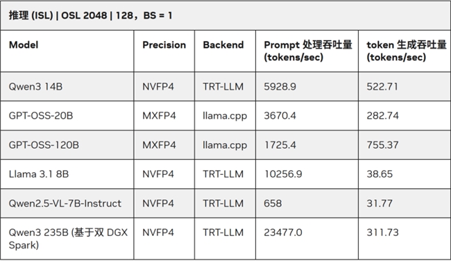 ·ISL(输入序列长度):输入提示词的数量,即Prefill tokens。 ·OSL(输出序列长度):模型在响应过程中生成token数量,即Decode tokens。 所以在本文的推理实践中采用了NVIDIA官方发布的NVFP4量化模型nvidia/Qwen3-30B-A3B-NVFP4,总参数量30B、单次激活参数量3B的MoE模型,可以最大化发挥硬件的内存与算力优势,是PGX的理想应用场景。 ·TensorRT-LLM + Qwen3-30B-A3B-NVFP4 采用NVIDIA官方推荐的TensorRT-LLM框架搭配NVFP4量化模型进行测试。 启动命令如下: