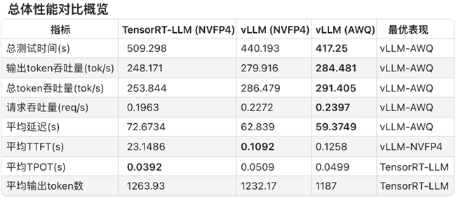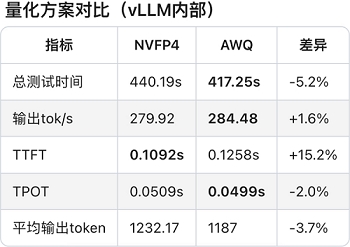 ·vLLM+Qwen3-30B-A3B-AWQ 如果使用较久的vLLM版本时,推荐可以使用AWQ量化的Qwen3-30B-A3B-AWQ模型。 AWQ作为成熟的量化技术,拥有完善的社区支持与大量实践验证。vLLM框架对AWQ的适配经过多轮优化,具有稳定高效的运行链路。 ·性能压测对比 使用第三方压测工具: 压测参数设置: ·url:请求URL ·parallel:并行请求数量 ·model:使用的模型名称 ·number:请求数量 ·api:使用的API服务类型 ·dataset:数据集名称 ·stream:是否启用流式处理 对比测试结果: ·TensorRT-LLM+Qwen3-30B-A3B-NVFP4 ·vLLM + Qwen3-30B-A3B-NVFP4' ·vLLM + Qwen3-30B-A3B-AWQ ·Latency(延迟):整体响应时间。 ·Throughput(吞吐量):每秒处理的请求数和token数。 ·TTFT(Time to First Token):首token时间,用户感知体验。 ·ITL:token间延迟,生成流畅度的关键指标。 ·TPOT(Time per Output Token):每token输出时间,生成效率的直接体现。 ·E2EL(End-to-End Latency):端到端延迟,完整请求的时间开销。 对比测试分析: