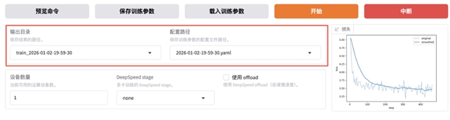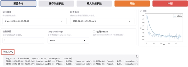 ·准备数据集 打开WebUI: 魔搭社区集成了相当丰富的中文数据集,有很多分类可以选。 找一个角色扮演的数据集来微调(方便查看效果)。 在数据预览这里查看详细数据。 注意,llama-factory目前只支持两种格式的数据集:Alpaca和Sharegpt格式。 切换到数据集文件这边,打开huanhuan.json文件,看到它其实就是Alpaca格式的数据集,仅下载这一个文件即可。 在llama-factory添加数据集,不仅要把数据文件放到data目录下,还需要在配置文件dataset_info.json里面添加一条该数据集的记录。这样,新添加的数据集才能被llama-factory识别到。 这里保存之后,webui那边会实时更新,不需要重启 ·执行微调 微调Qwen3-1.7B-Base基础大模型,方法选用LoRA。 ·Base基础预训练模型。 ·没有经过指令微调。 ·适合继续预训练或指令微调。 ·Base通常情况下输出质量不如Instruct版本。 使用huanhuan数据集,先训练1轮看看效果,如果效果不理想再多训练几轮。由于数据集都是一些短问答,可以把截断长度设置小一点,为1024(默认是2048)。梯度累计设置为4。注意,计算类型选择BF16,暂不支持FP4。 继续设置LoRA微调参数: ·LoRA秩:可以看作学习的广度,越大学习的东西越多,微调之后的效果可能会越好,但是也不是越大越好。太大的话容易造成过拟合(书呆子,照本宣科,不知变通),这里设置为8。 ·LoRA缩放系数:可以看作学习强度,越大效果可能会越好,对于一些用于复杂场景的数据集可以设置更大一些,简单场景的数据集可以稍微小一点。这里设置256。 预览训练指令并开始训练。 stage:指示当前训练的阶段,枚举值sft、pt、rm、ppo等,这里我们是有监督指令微调,所以是sft。 ·do_train:是否是训练模式。 ·dataset:使用的数据集。 ·dataset_dir:数据集所在目录,这里是data。 ·finetuning_type:微调训练的类型,枚举值lora、full、freeze等,这里使用lora。 ·output_dir:训练Checkpoint保存的位置。 ·cutoff_len:训练数据集的长度截断。 ·per_device_train_batch_size:每个设备上的batch size,最小是1,如果GPU显存够大,可以适当增加。 ·bf16:训练数据精度格式。 ·max_samples:每个数据集采样多少数据。 ·val_size:随机从数据集中抽取多少比例的数据作为验证集。 ·logging_steps:定时输出训练日志,包含当前loss,训练进度等。 ·adapter_name_or_path:LoRA适配器路径。 ·开始之后,会启动一个新的训练进程。 如果本地没有找到模型,会先自动下载模型: 开始训练后可以查看进度条和损失值曲线。