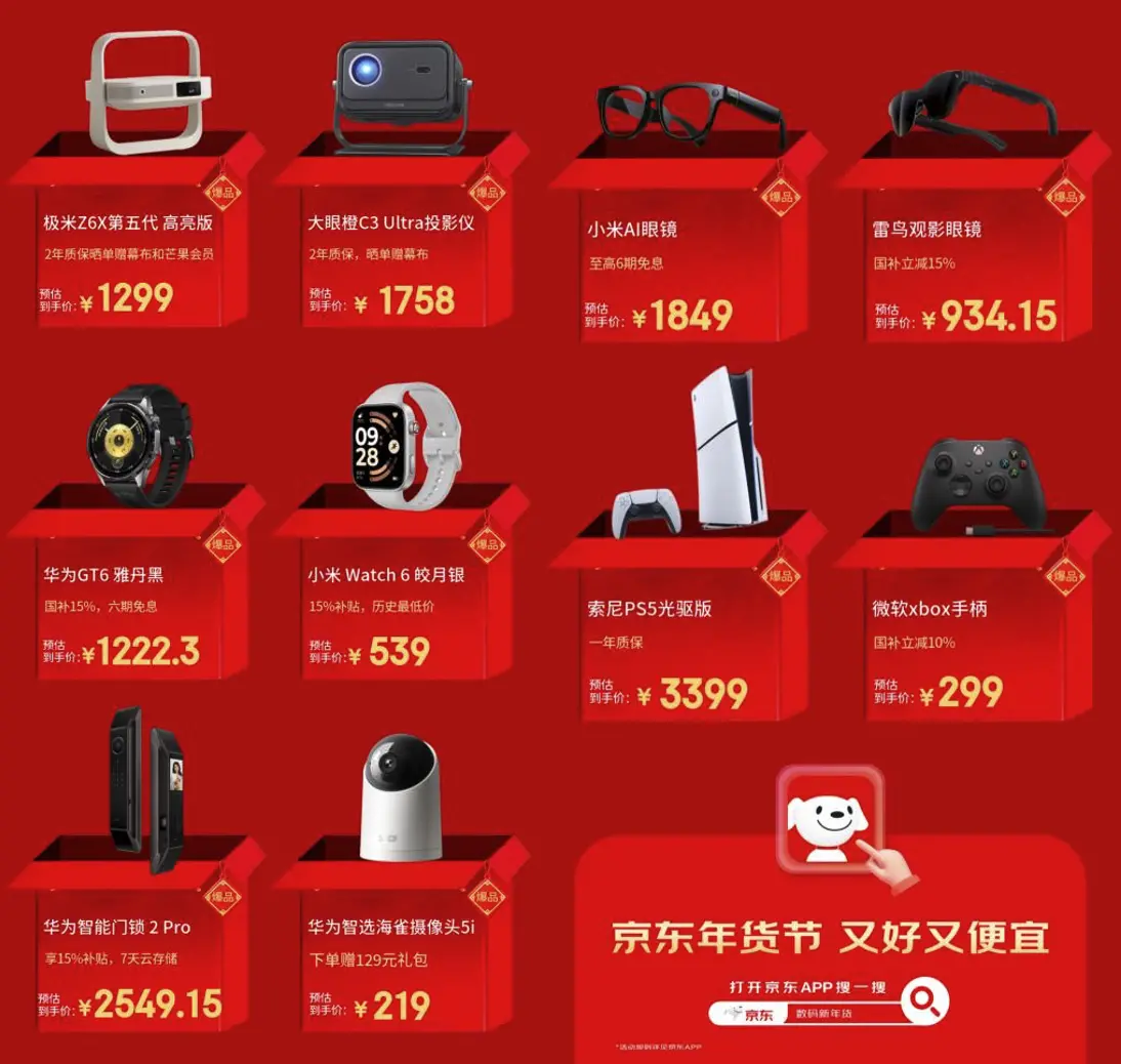 想要打造沉浸式的家庭影院,一款优质的投影仪必不可少。极米Z6X第五代 高亮版 凭借清晰的画质与便捷体验,能轻松将客厅变为私人观影厅,晒单还赠幕布和芒果会员,预估到手价仅1299元。若追求更强的性能与视听表现,大眼橙C3 Ultra 则是打造沉浸影音的优质选择,同样享有2年质保与晒单赠幕布福利,预估到手价1758元。两款均为提升居家幸福感的高性价比之选。 智慧生活升级同样触手可及。腕间健康伴侣可选 华为Watch GT 6雅丹黑,享国补15%及66期免息优惠,全能运动健康助手预估到手价仅1222.3元;若追求极致性价比,小米Watch 6皎月银 迎来补贴后历史新低,到手价仅需539元。居家安防方面,华为智能门锁2 Pro 享15%补贴并赠7天云存储,安全一步到位,预估到手价2549.15元;华为智选海雀摄像头5i 小巧智能,下单即赠129元礼包,看家护院、照看萌宠皆方便,预估到手价219元。 对于科技玩家,前沿设备也有诚意好价。小米AI眼镜支持至高6期免息,预估到手价1849元即可开启全新交互视野;雷鸟观影眼镜享国补直降15%,预估934.15元即可拥有,随时随地享受私密大屏的沉浸观影。游戏玩家不妨重点关注索尼PS5光驱版,以3399元入手,即可畅享震撼的游戏体验;若想进一步提升操作手感,微软Xbox手柄国补立减10%,到手价299元,无论是搭配PC还是主机,都能让游戏操控更加流畅尽兴。