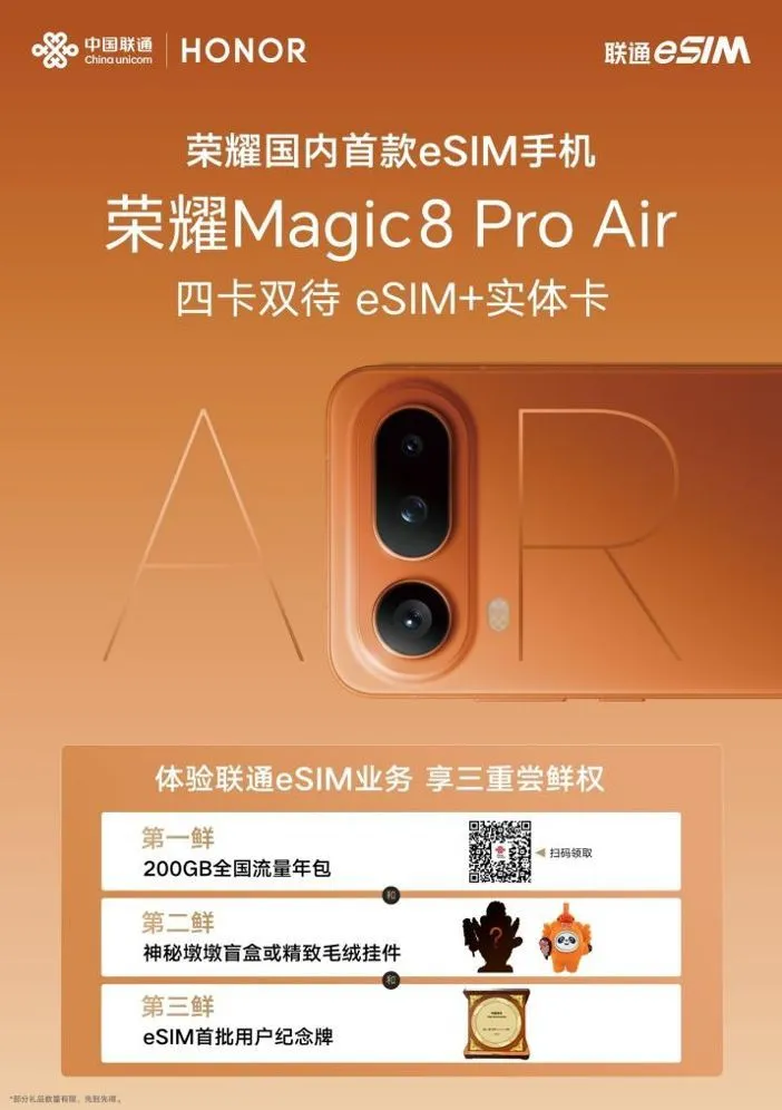 为让用户充分体验eSIM技术带来的便捷,京东与中国联通推出“e补”三重价值权益政策,涵盖话费即时到账、200G全国流量全年畅享、出境商旅线上便捷办理等实用服务。1月23日-2月28日活动期间,消费者在京东购买荣耀Magic8 Pro Air,并在线下营业厅开通eSIM业务(包括开新卡、eSIM转eSIM、携号转网并开通eSIM等),均可获得200G全国通用流量年包,以及毛绒挂件等多重好礼。