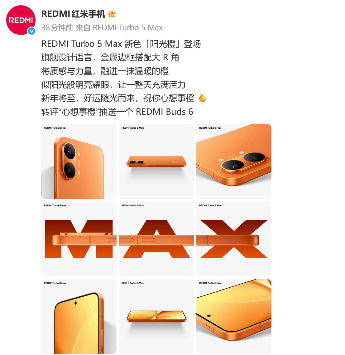 【科技快报网】REDMI Turbo 5系列将于1月29日发布。今天“REDMI红米手机”官微公布了REDMI Turbo 5 Max新机“阳光橙”配色,寓意“心想事橙”。 官方称这是 REDMI 史上最具旗舰质感的性能机,CNC金属中框,优雅大R角;旗舰同款玻纤背板,Deco 双环涡轮灯带,不同场景特定灯效提醒,科技与美学的自然融合。 配置方面,全球首发联发科天玑9500s芯片,搭载 9000mAh 小米金沙江电池,性能、续航双max。非常值得期待。