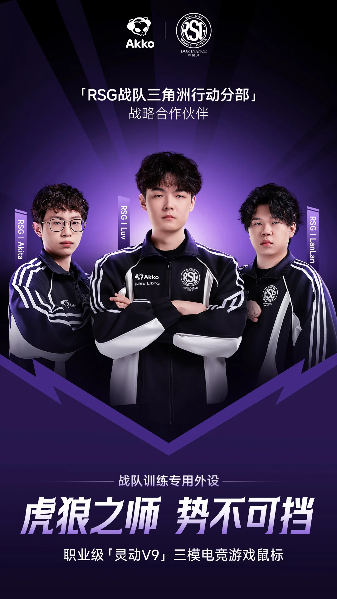 职业战队,强强联合 Akko灵动V9 Ultra 的卓越性能,不仅源于实验室的打磨,更经过了职业电竞的严苛考验。我们荣幸地宣布,Akko品牌战略合作伙伴——职业电竞俱乐部RSG战队三角洲行动分部,选择灵动V9 Ultra 作为其训练专用外设。RSG战队的职业选手们对V9 Ultra 的超轻量化设计带来的操控灵活性、Akko定制引擎的精准追踪稳定性、以及欧姆龙光微动干脆利落的触发手感给予了高度评价,认为其能为高强度、快节奏的战术竞技提供可靠的硬件支持。这份来自电竞职业力量的信任,是对灵动V9 Ultra 电竞血统与产品实力的最佳背书。