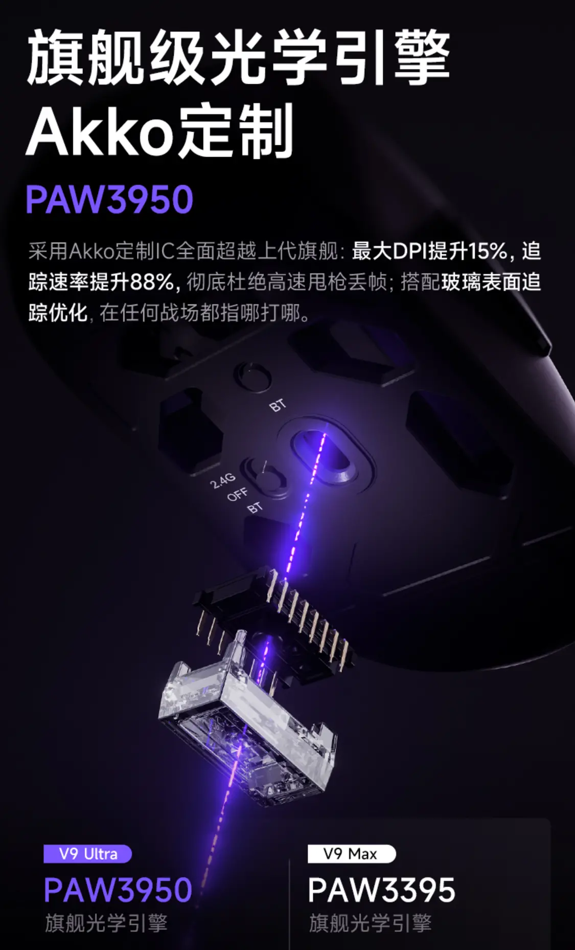 Akko定制PAW3950旗舰级光学引擎,精准制胜 灵动V9 Ultra的心脏部位采用了 Akko 定制 PAW3950 旗舰光学引擎。其性能全面超越上代旗舰:最大DPI提升15%,追踪速率跃升88%,不再受高速甩枪时丢帧现象困扰。配合针对玻璃表面等特殊材质的追踪优化技术,实现最高30000原生DPI(可超频至42000)、750 IPS追踪速度与50G加速度,真正做到“指哪打哪”,在任何战场表面皆稳定可靠。支持多档LOD(静默高度)可调,满足不同握持习惯。