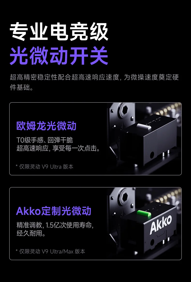 卓越交互,手感定义 微动体验:灵动V9 Ultra 甄选欧姆龙光微动(另有Akko定制光微动版本可供选择),提供T0级清脆手感与超高速响应,每一次点击都回弹干脆,确认感十足,带来可靠的触发体验。