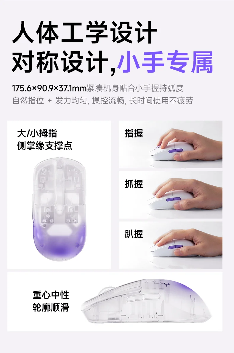 以人为本的设计哲学 采用对称式人体工学设计,精心优化的曲线能紧密贴合中小手型玩家的掌部,提供饱满且舒适的握持感受,长时间游戏或办公也不易疲劳,被誉为“小手万金油”,兼顾灵活与稳定。