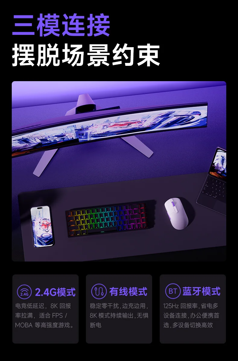 三模连接:支持有线、蓝牙、2.4G无线三种连接模式,轻松应对游戏、办公、移动等多场景切换,摆脱线缆束缚。
