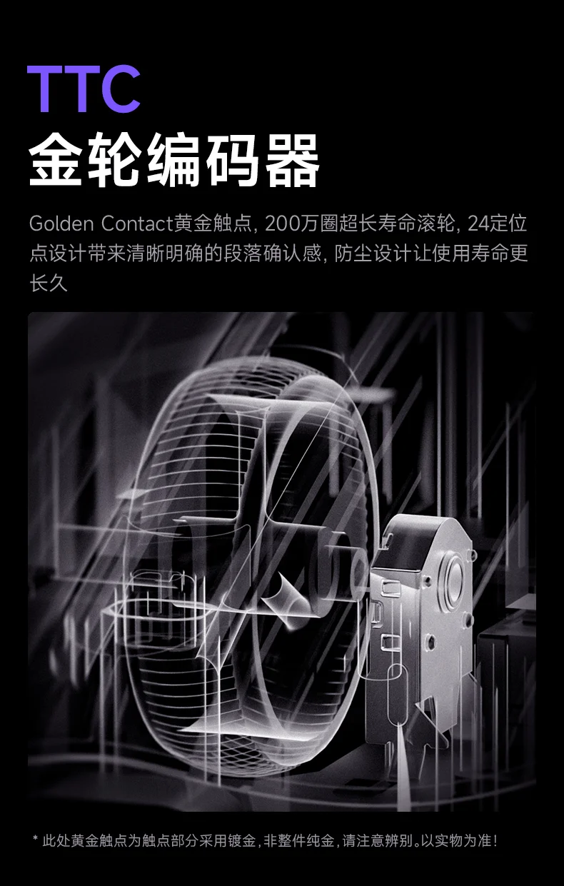 滚轮编码器:采用TTC金轮编码器,其黄金触点与防尘设计,结合200万圈超长寿命与24定位点的清晰段落感,确保浏览与操作精准顺滑,经久耐用。