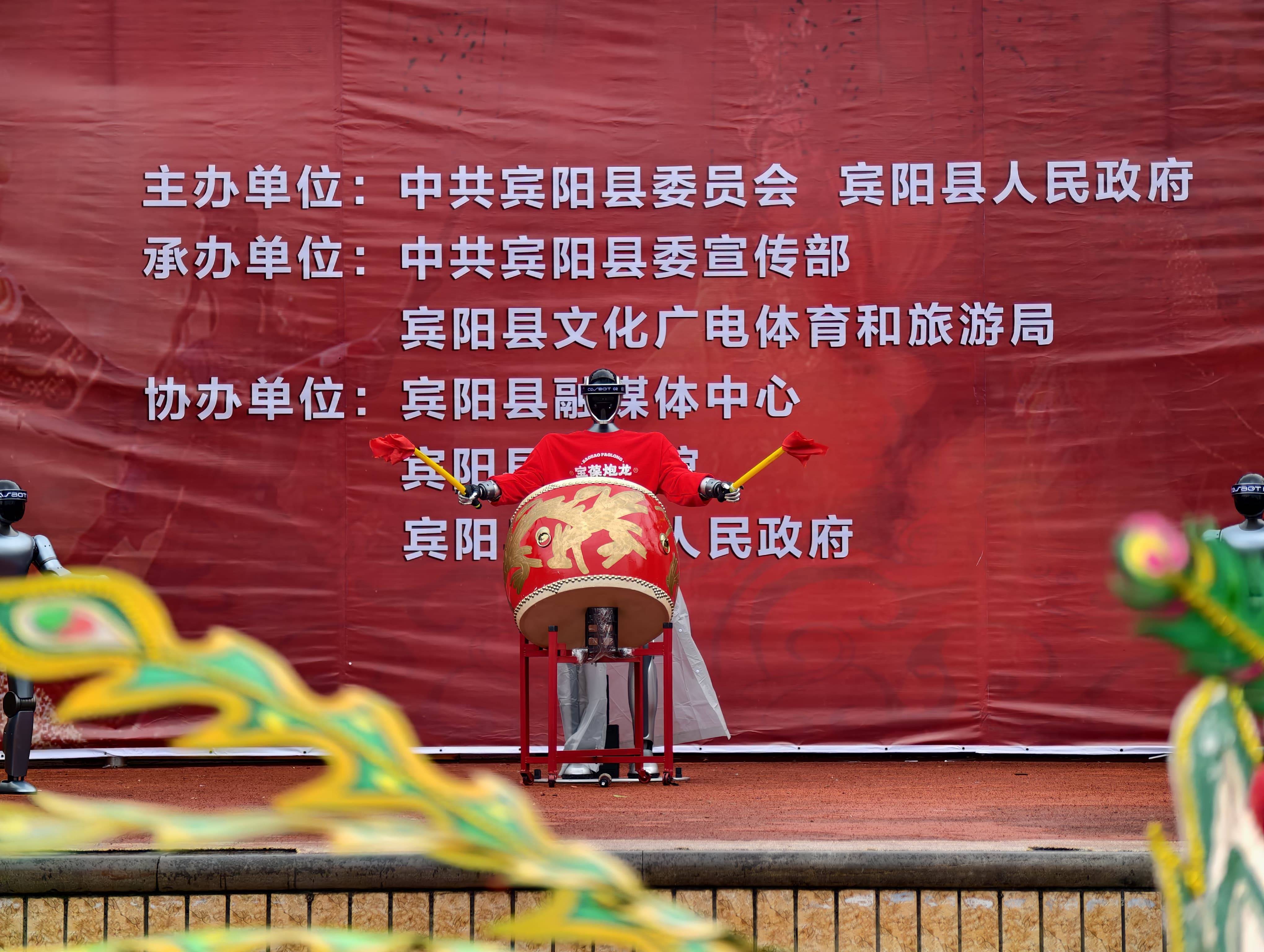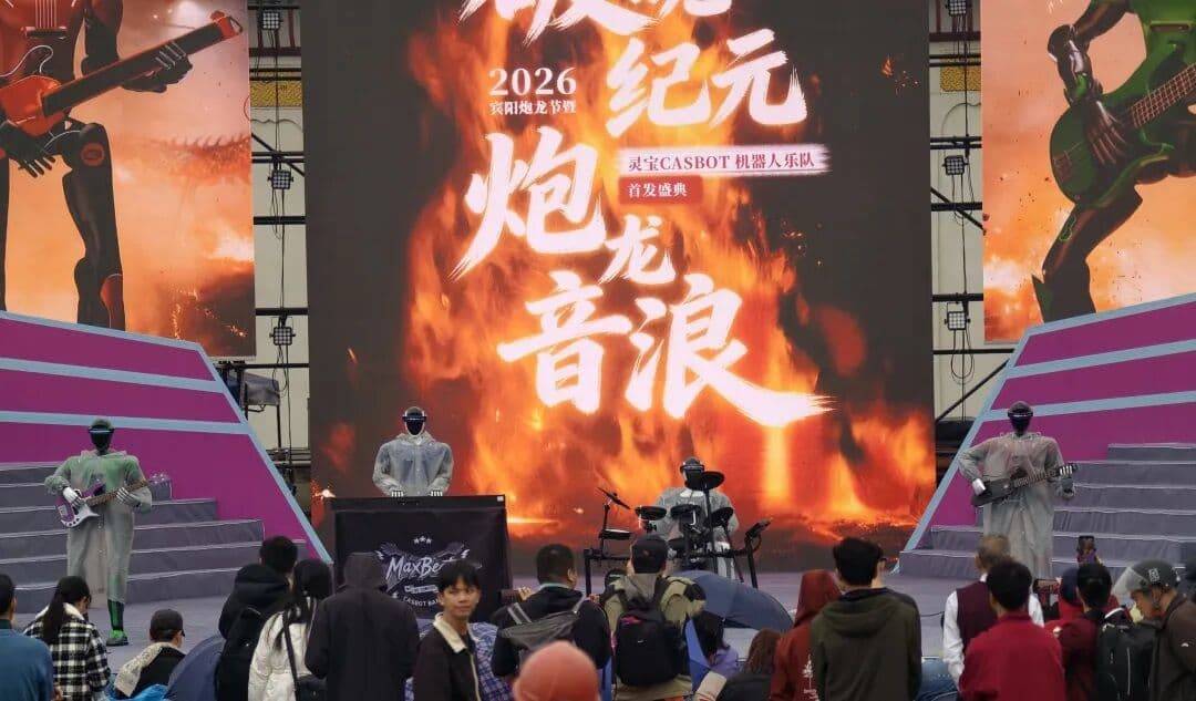 宾阳炮龙节传承上千年,是广西宾阳最具代表性的传统民俗活动之一,并于2008年被列入国家级非物质文化遗产名录。每年农历正月初十、十一,当地举行炮龙巡游、鞭炮炸龙、灯会演出等系列活动。龙舞翻腾、爆竹齐鸣,形成极具张力的节庆场面。今年节庆期间,灵宝CASBOT机器人乐队首次以乐队形态参与非遗活动。2月26日上午,2026宾阳炮龙节暨灵宝CASBOT机器人乐队首发盛典在宾阳县炮龙广场举行。现场,灵宝CASBOT机器人乐队完成演奏展示,多机协同动作与节奏保持一致,在开放广场环境中稳定运行。随后,“舞动新春 龙马精神”具身机器人巡游活动正式启动。