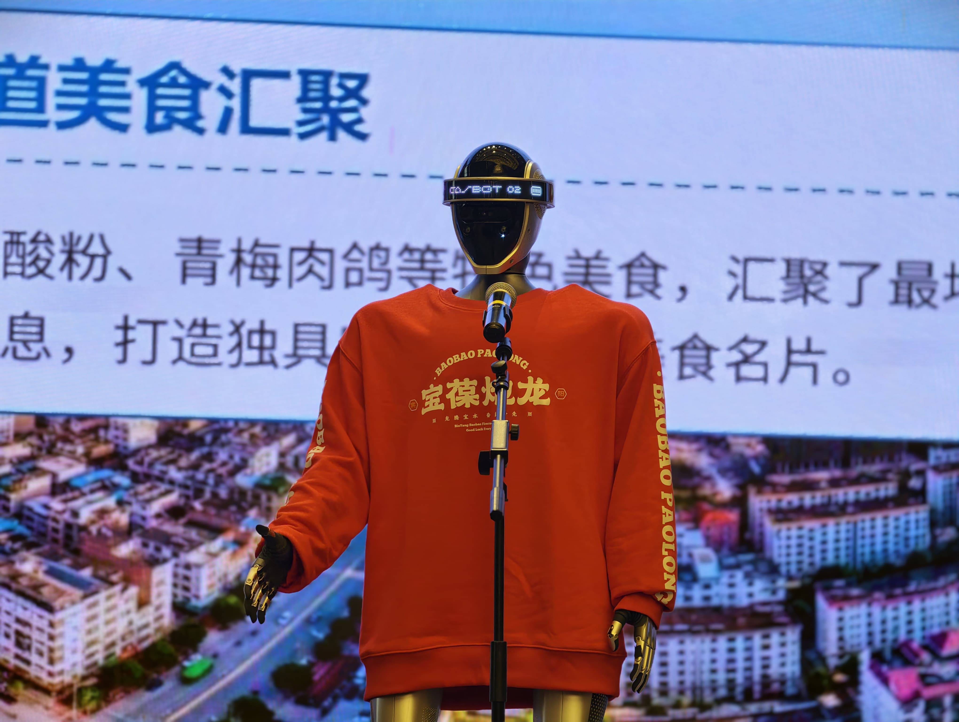 次日,2026年炮龙节招商引资推介会暨项目签约活动举行。受地方政府的邀请,CASBOT 02还担任了“推介大使”的荣誉角色,在签约活动上以具身形态介绍宾阳经济社会发展情况,并与县委书记共同向嘉宾送上新春祝福。机器人由节庆巡游走入政务会场,成为科技参与城市推介的新型表达方式,也直观呈现出具身智能在公共事务场景中的应用潜力。