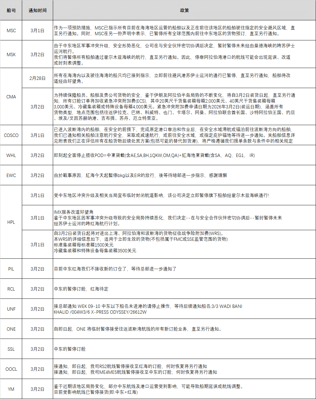 表:主要船公司最新政策汇总 2. 战争风险附加费(WRS)及紧急冲突附加费(ECS) 多家船公司已宣布征收附加费(如赫伯罗特、达飞等)。 三、我司应对方案 1. 国际海运 在途订单:所有通过我司订舱但仍未到港的途经受影响航线的业务,我司客服已完成第一轮跟踪并每日将情况反馈给客户,随时配合客户做好紧急应对; 待运订单:所有已下达给我司但未订舱的托单,因近期各船东在船期、仓位及价格等方面变化频繁,我司销售会单票与客户沟通出运方案; 2. 国际空运 对于中东地区货物,可考虑经中亚(阿拉木图)、俄罗斯(莫斯科)或东南亚(曼谷、新加坡)转机的替代航线; RUH(利雅得)、IST(伊斯坦布尔)、CAI(开罗)三个机场目前开放,可作为暂时前往中东地区的备选空运口岸。 3. 国际铁路 对于欧洲和地中海区域的货物,除传统中欧班列线路外,我司还可提供通过中亚中转的铁路替代方案、以及跨境卡车服务方案。如有需求可联系我司销售。 如果您对以上信息有任何疑问,或有紧急订单等需求的,请随时与我司销售或应急小组成员联系,密尔克卫将竭诚为您服务。 在这段特殊时期内,或将对您委托货物的交期造成一些影响,对此我司深表歉意,并期待您能给予一如既往地理解与支持。密尔克卫也将持续关注并更新信息,全力保障客户的各项生产作业计划。 此致 敬礼 密尔克卫智能供应链服务集团股份有限公司 2026年3月4日 |