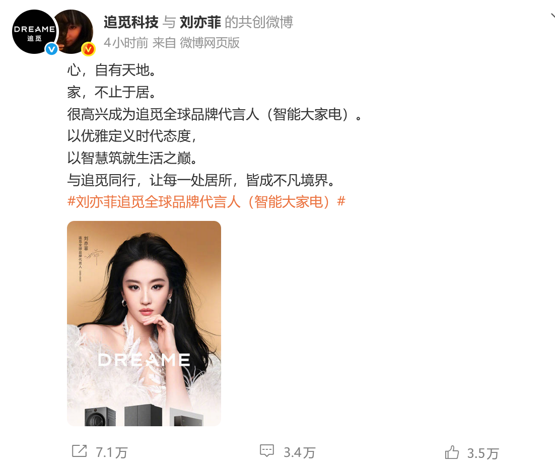 【科技快报网】今日,追觅科技宣布刘亦菲出任全球品牌代言人(智能大家电),此举被视为其加码高端智能大家电、冲击全球市场的信号。