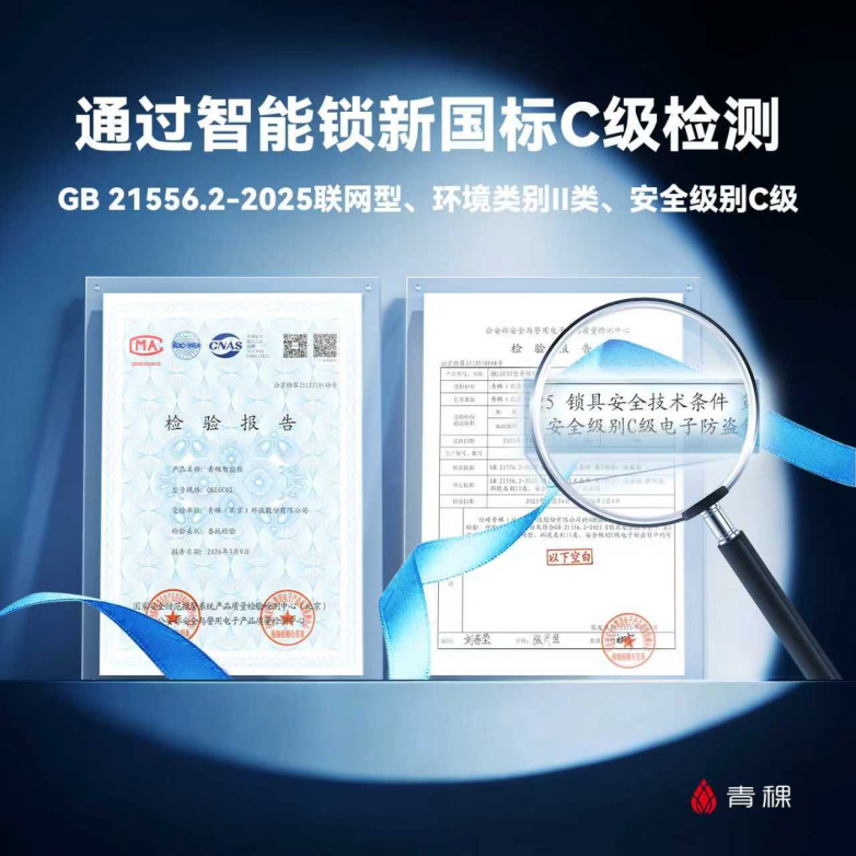 2026年3月1日,智能锁新国标GB 21556.2-2025正式实施,这一强制性国标的落地,标志着中国智能锁行业将迎来规范化发展的全新拐点。就在这一行业关键节点,3月9日,青稞智能锁C7C率先通过公安部安全与警用电子产品质量检测中心新国标安全级别C级检测,以行业标杆之姿,为消费者带来实打实的安全保障、为行业伙伴树立高质量发展新航标。
