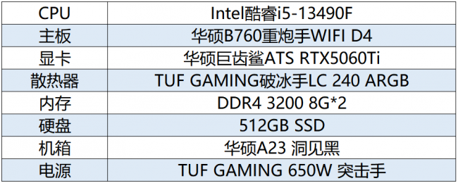 D4主板为核心,搭配酷睿i5-13490F处理器、华硕巨齿鲨ATS