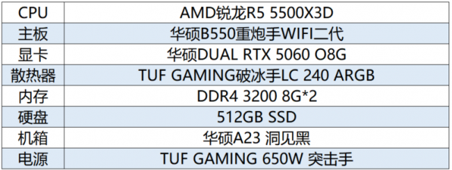 首先为大家推荐一套极具性价比的锐龙5000电竞平台。以华硕B550重炮手WIFI二代主板为核心,搭配AMD锐龙5 5500X3D处理器,华硕DUAL RTX 5060 O8G显卡等高性能硬件,高帧畅玩无压力!
